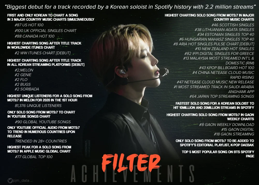 Filter se convierte en la primera canción solista coreana en la historia en superar los 16 millones de transmisiones en Youtube Music, convirtiéndose en el solo coreano más transmitido en la plataforma 🎉🎉