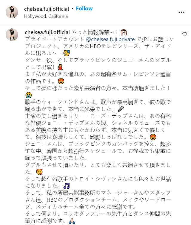 Chelsea Fuji, la doble de Jennie en “The Idol”, escribió en Instagram que la integrante de BLACKPINK estaba "súper ocupada" con un "horario súper estricto de Corea". Mientras filmaba, la bailarina notó que “trabajó duro a pesar de sus heridas”.